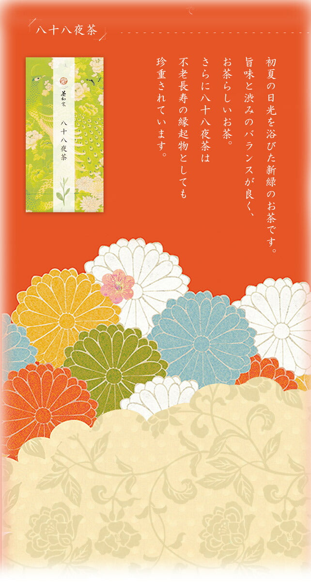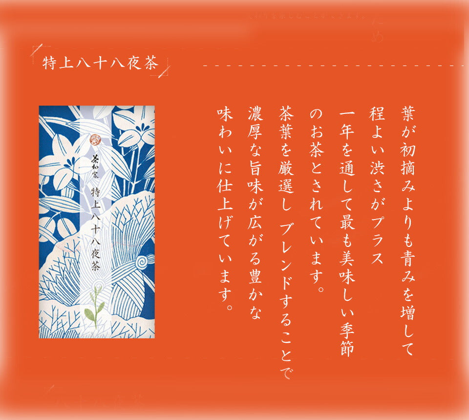 It is said that drinking fresh tea from the first harvest will keep you in good health for a year. In addition, Hachijuhachiya Shincha is a tea that brings good luck and good health.