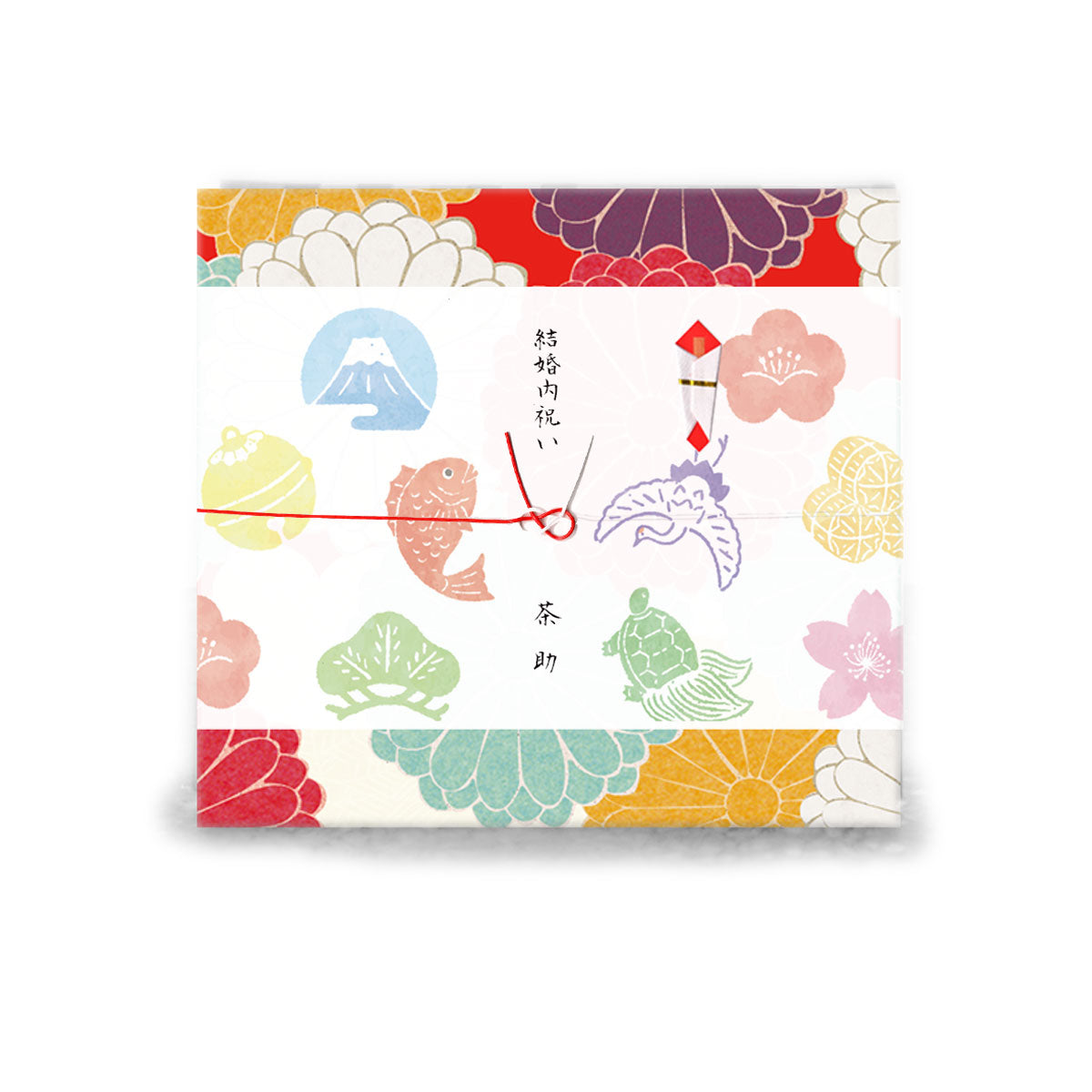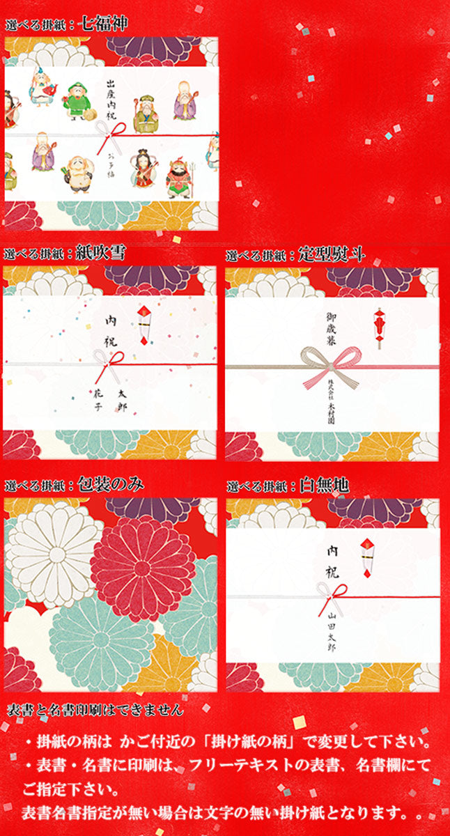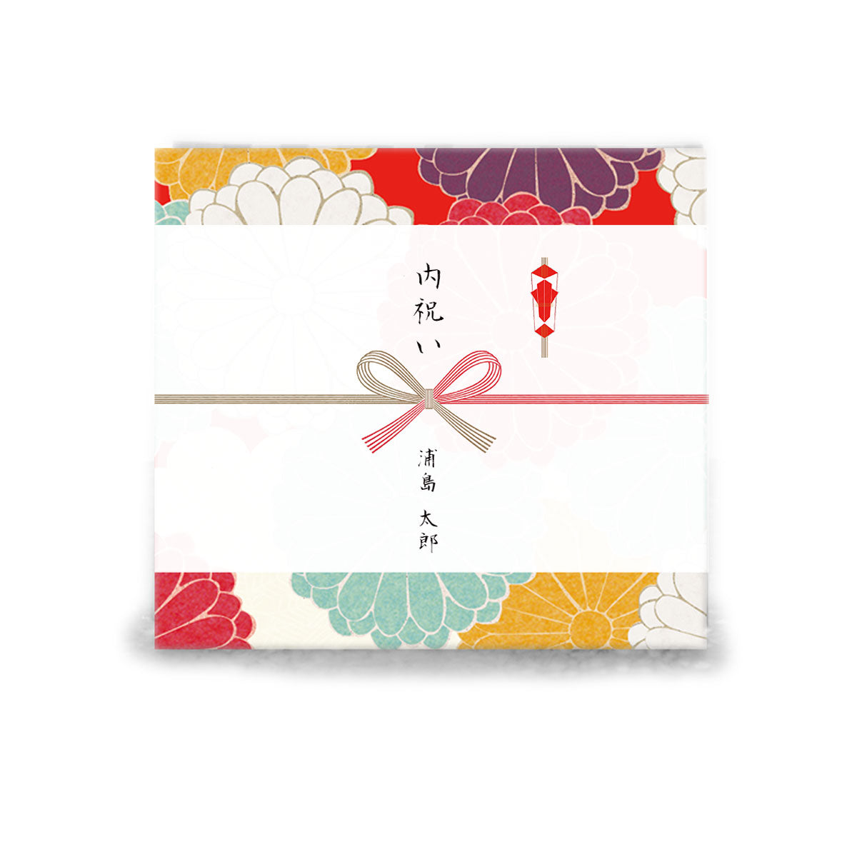 The hanging paper is tied with a red and white bow knotted mizuhiki, and a noshi is attached. This is our original wrapping.