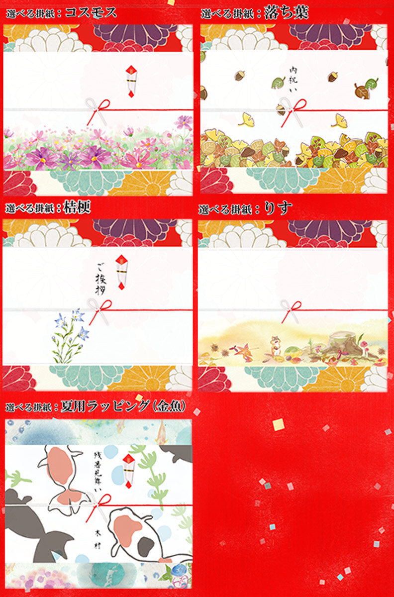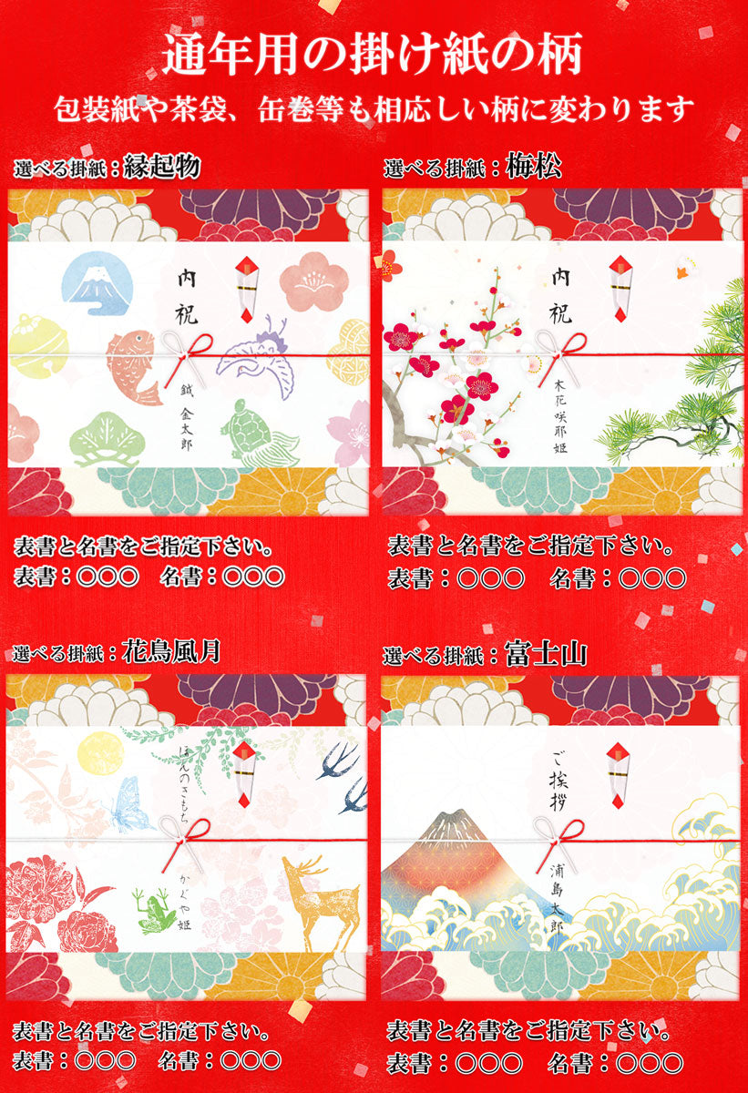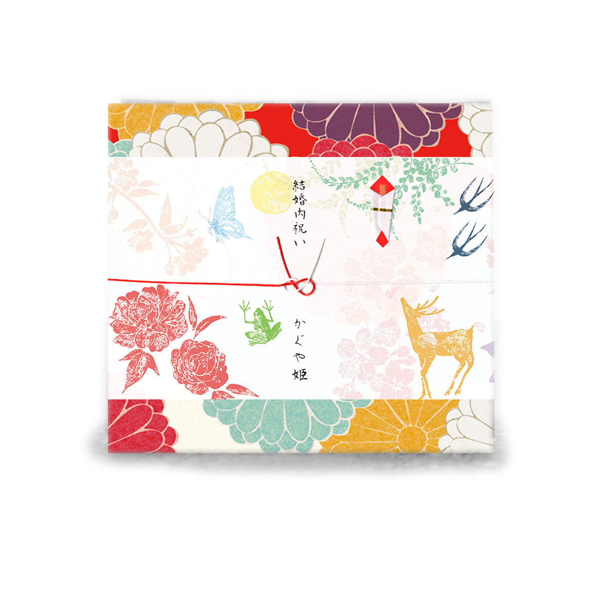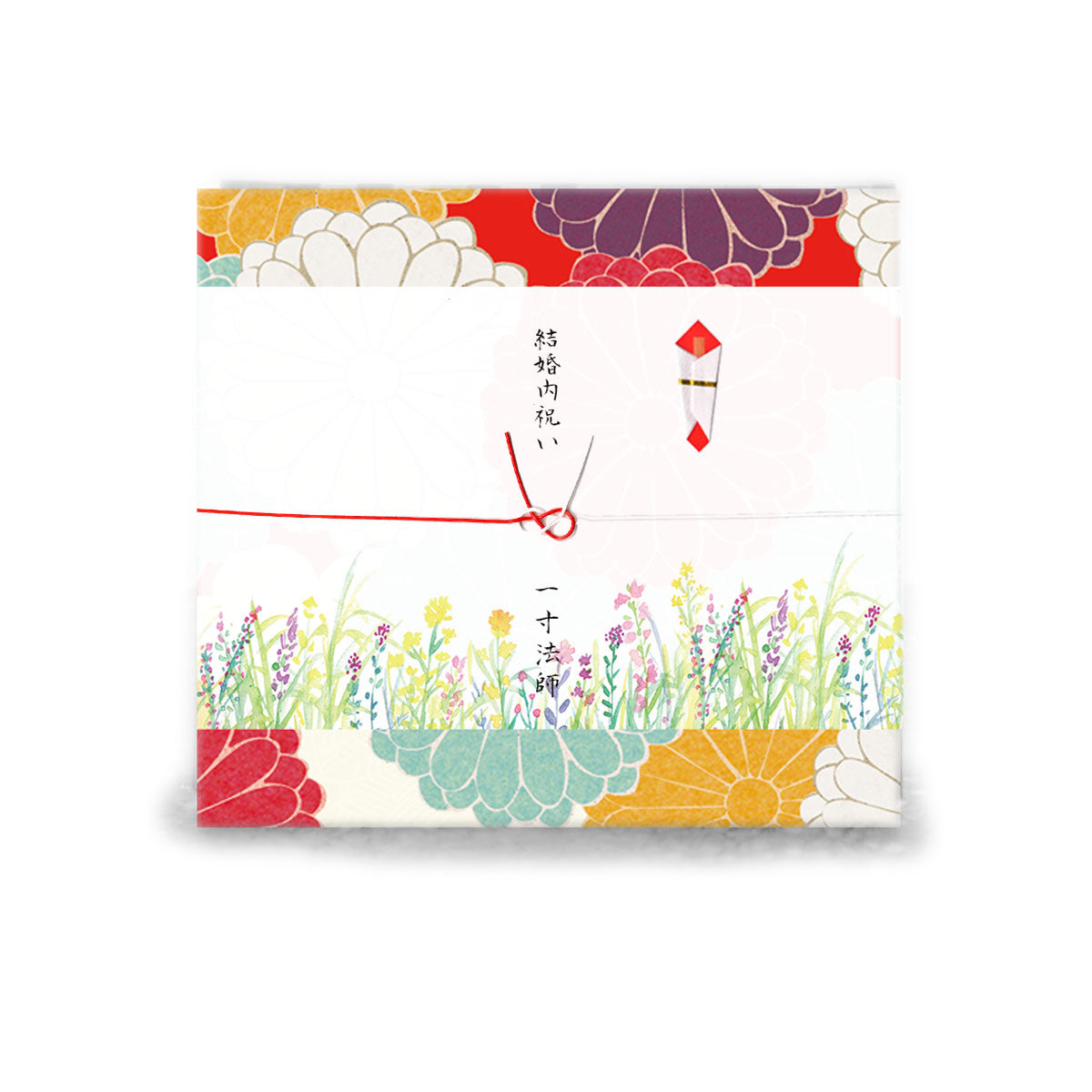 The hanging paper is tied with a red and white bow knotted mizuhiki, and a noshi is attached. This is our original wrapping.