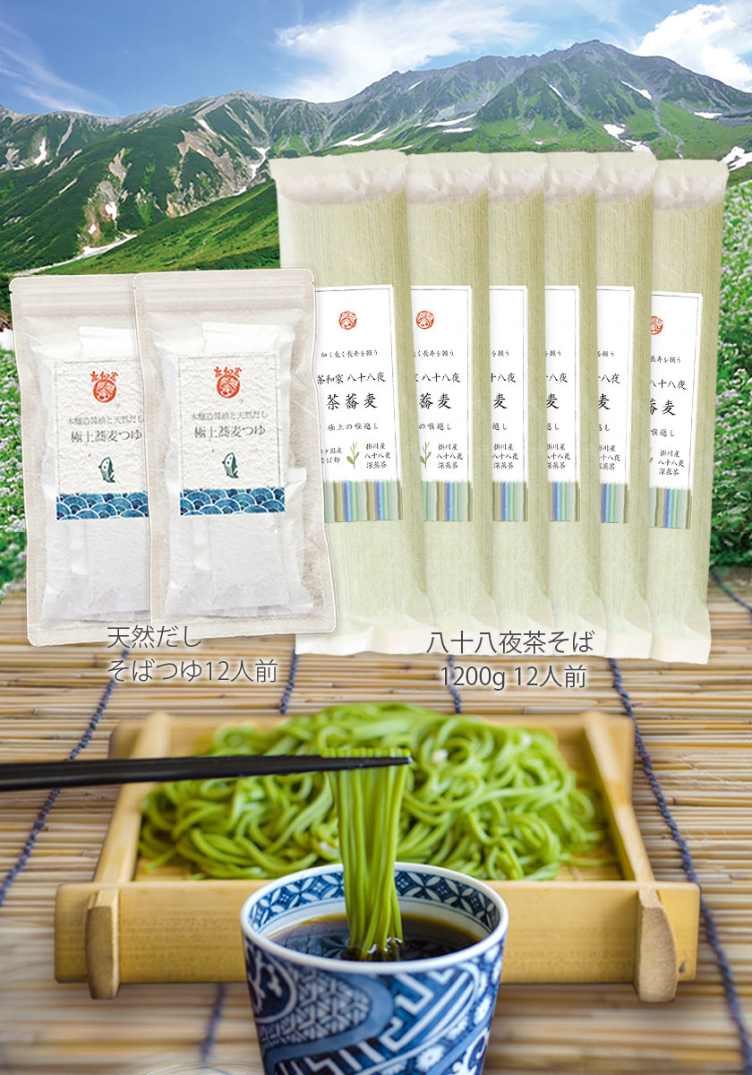 Eighty-eighth night tea is an auspicious tea that prays for eternal youth and longevity. Soba contains the wish for a long and thin life. We recommend Eighty Eighth Night Tea Soba, which contains two healthy ingredients, tea catechins and buckwheat rutin, as a gift for good health.