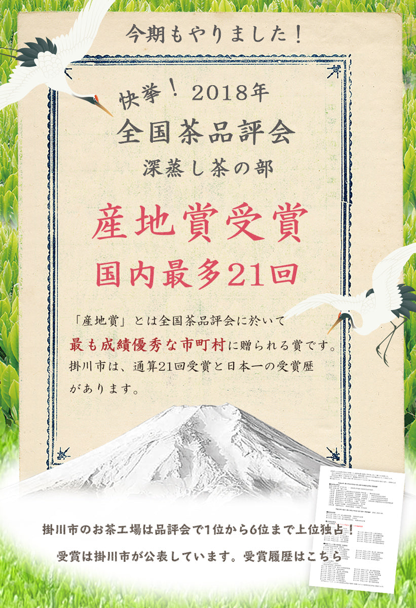 Place of origin: Kakegawa City, Shizuoka Prefecture Manufacturer: Kimuraen Co., Ltd. 2083 Shimotaragi, Kakegawa City, Shizuoka Prefecture (Manufactured by the Nakayama Tea Industry Association and remanufactured by Kimuraen.)