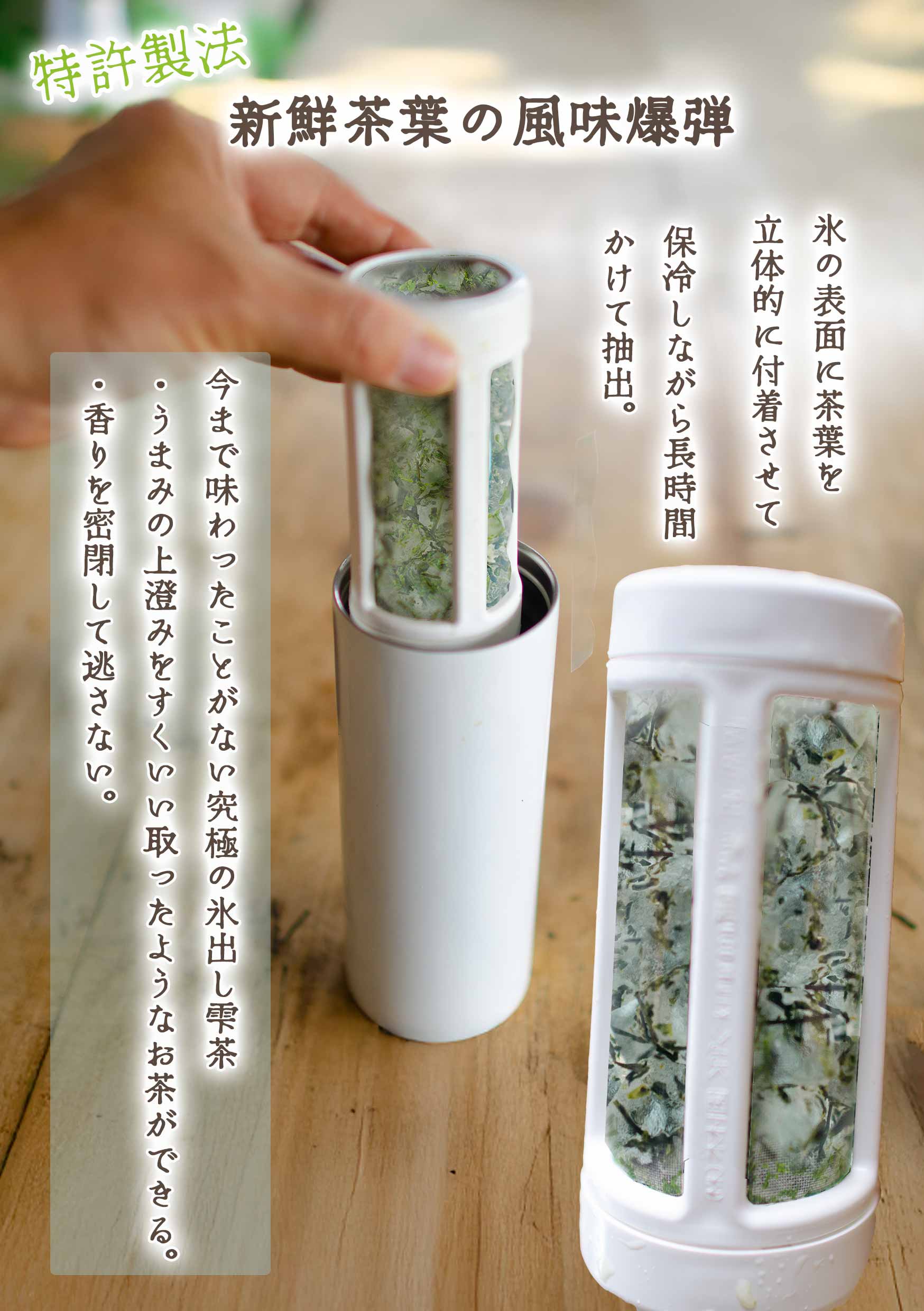 ![[Patented method for producing a flavor bomb of fresh tea leaves] The tea leaves are attached three-dimensionally to the surface of the ice, and are extracted for a long time while being cooled.](https://image.rakuten.co.jp/kimuraen/cabinet/11057973/m2-02.jpg)
