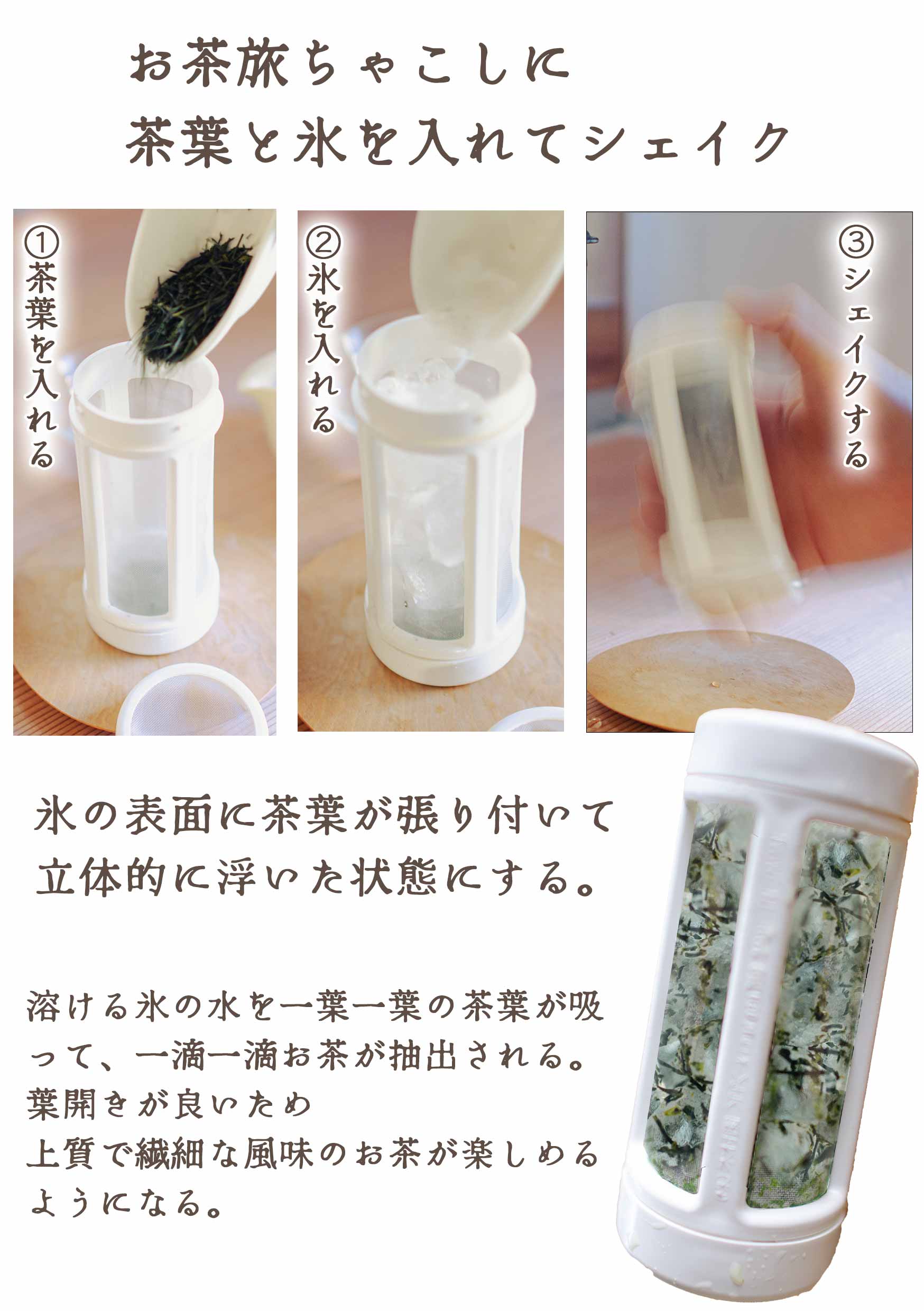 ![[Put tea leaves and ice in the tea strainer and shake] 1. Put tea leaves in the tea strainer, 2. Put ice in, 3. Put the lid on the tea strainer and shake. The tea leaves will stick to the surface of the ice and float three-dimensionally. The tea leaves will absorb the water from the melting ice and tea will be extracted drop by drop.](https://image.rakuten.co.jp/kimuraen/cabinet/11057973/m2-03.jpg)