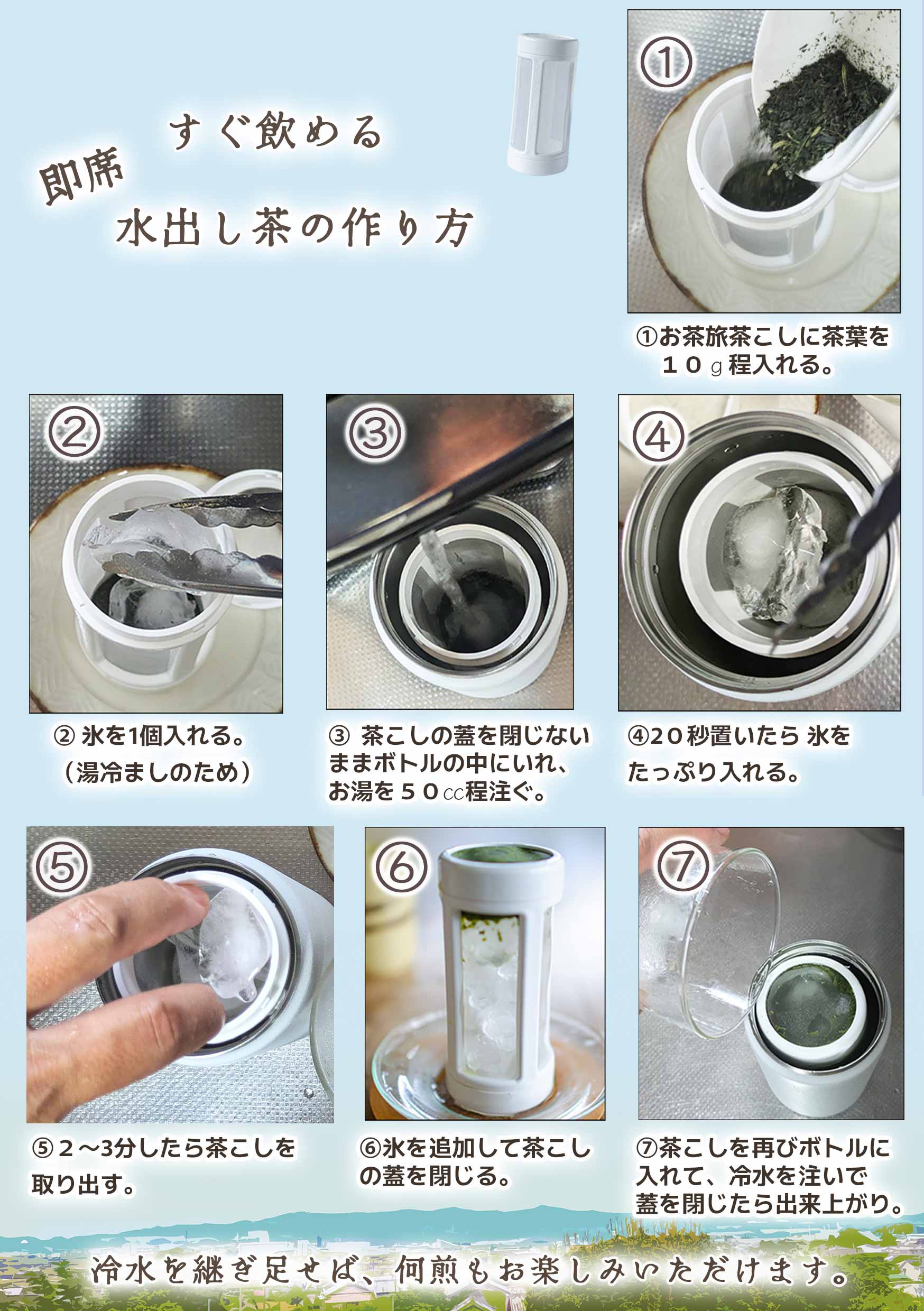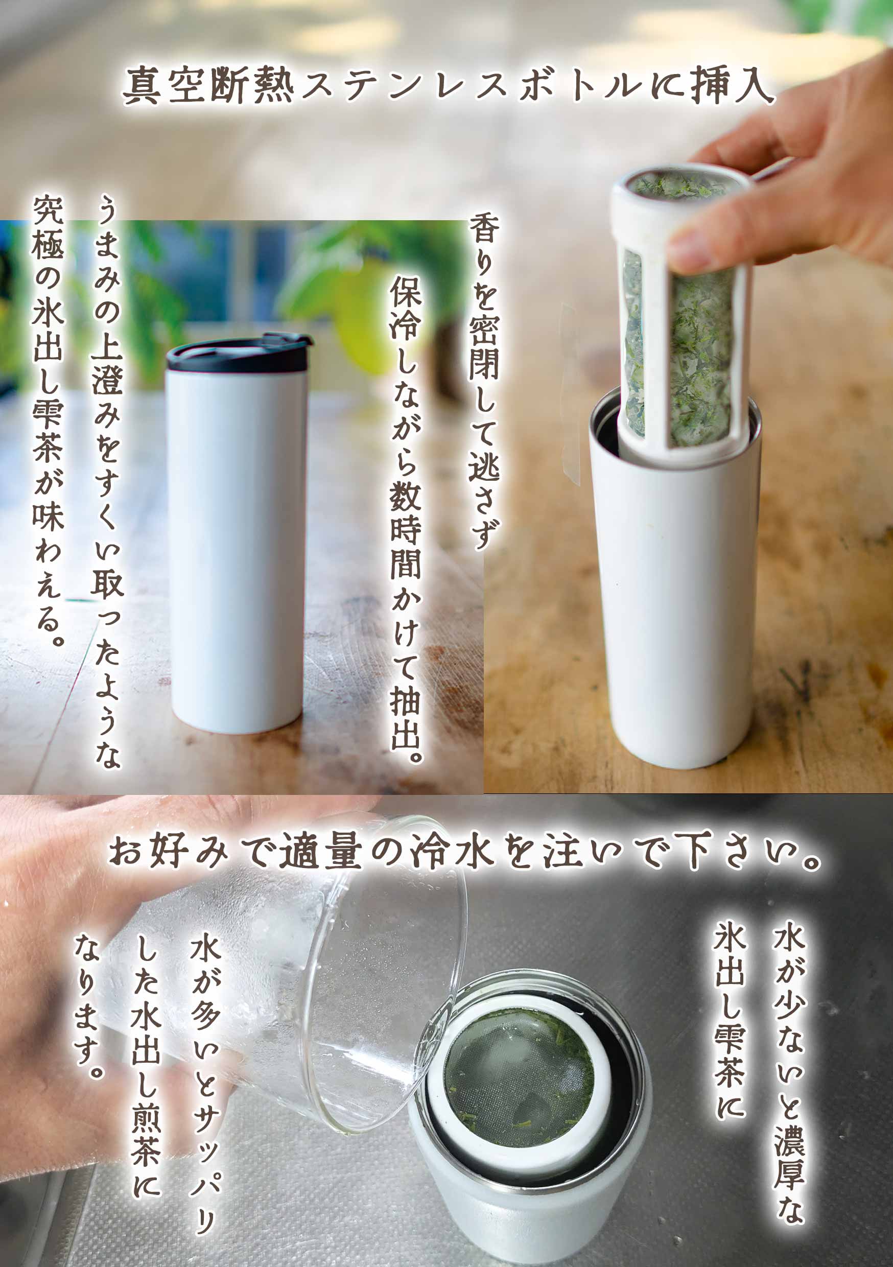 ![[Put into a vacuum insulated stainless steel bottle] Protects the aroma and keeps it from escaping. Extracts for several hours while keeping it cold. Enjoy the ultimate iced tea, like the cream of umami has been scooped out. / Add an appropriate amount of cold water to your liking. Using less water will result in a rich iced tea.](https://image.rakuten.co.jp/kimuraen/cabinet/11057973/m2-04.jpg)