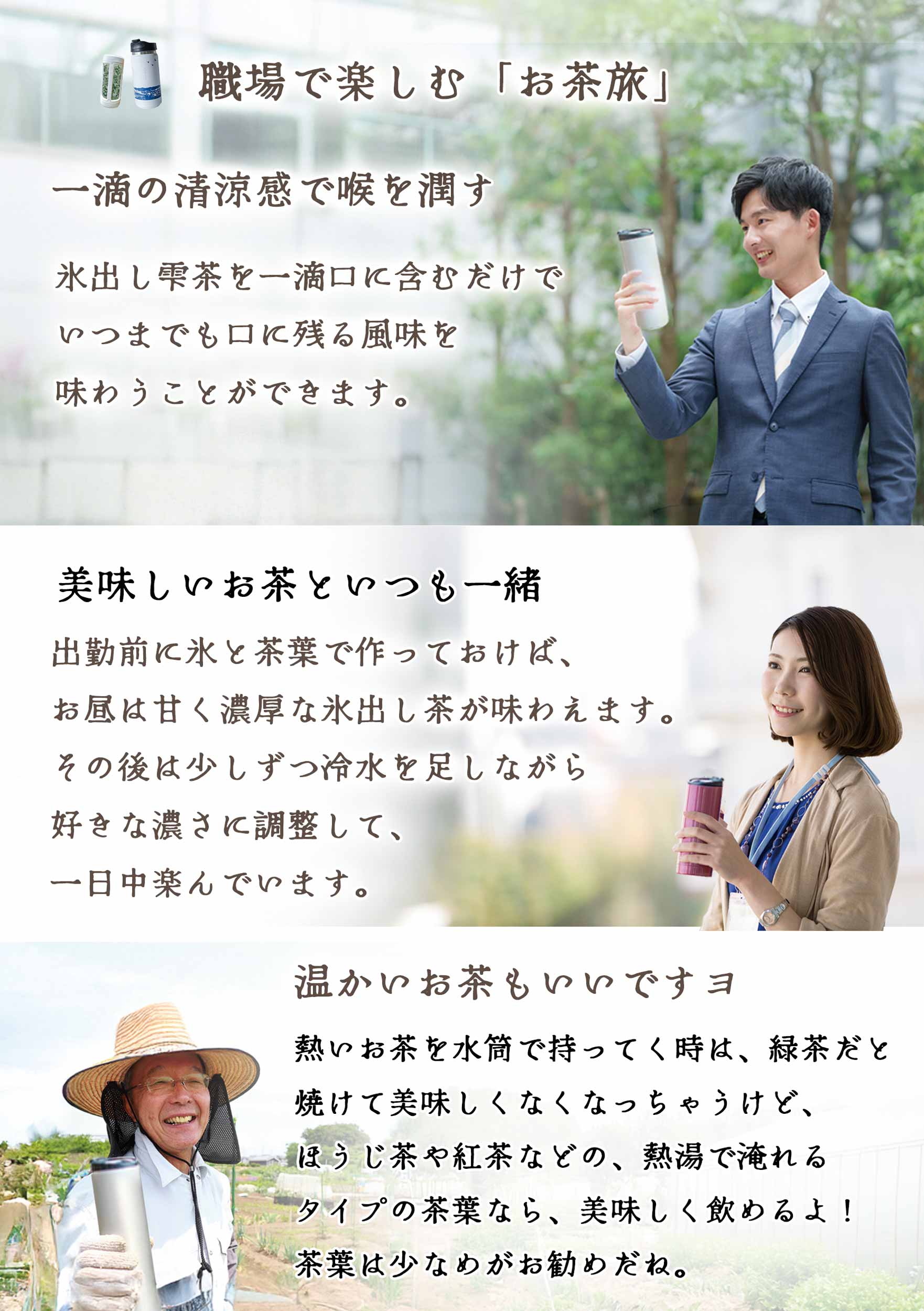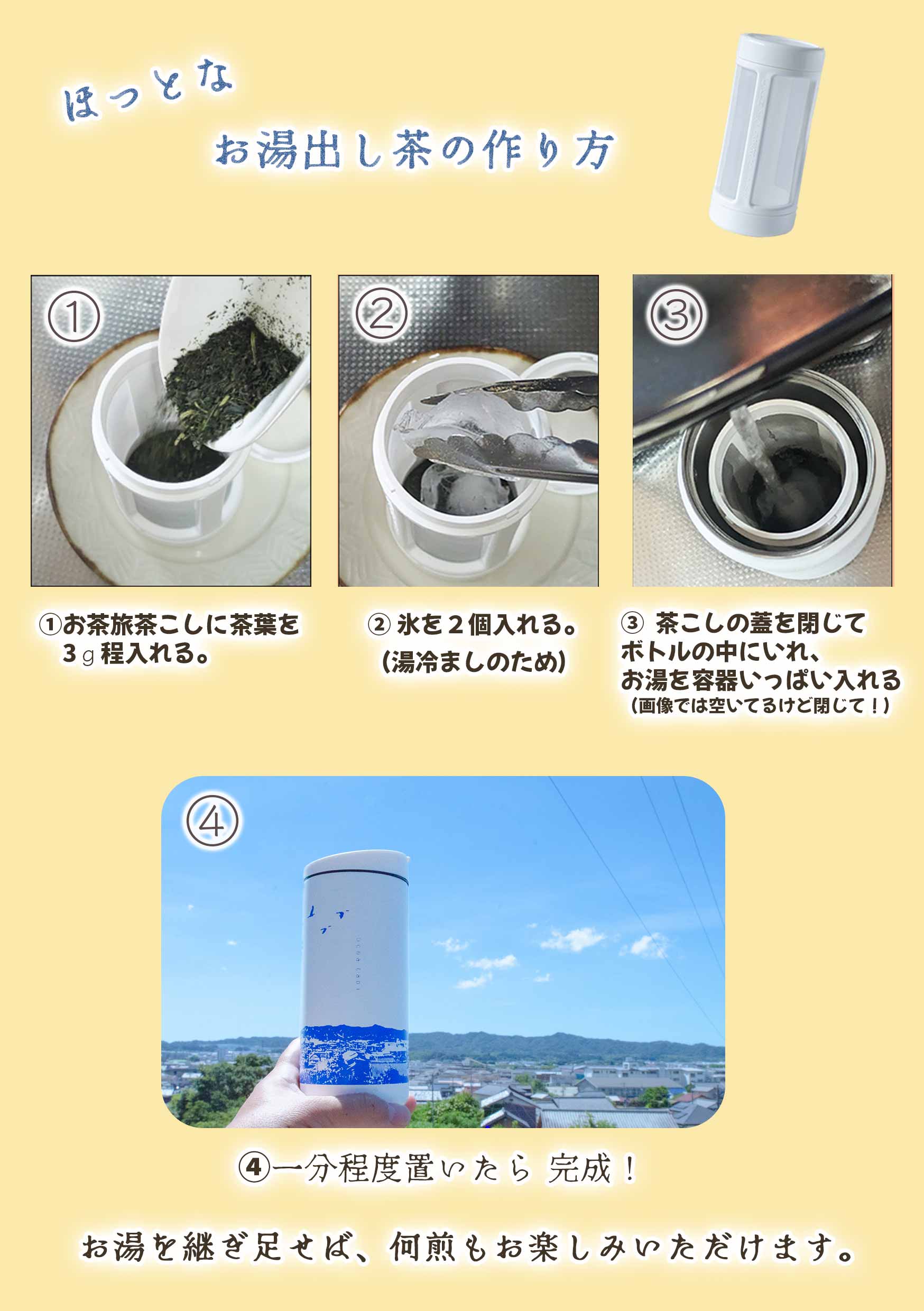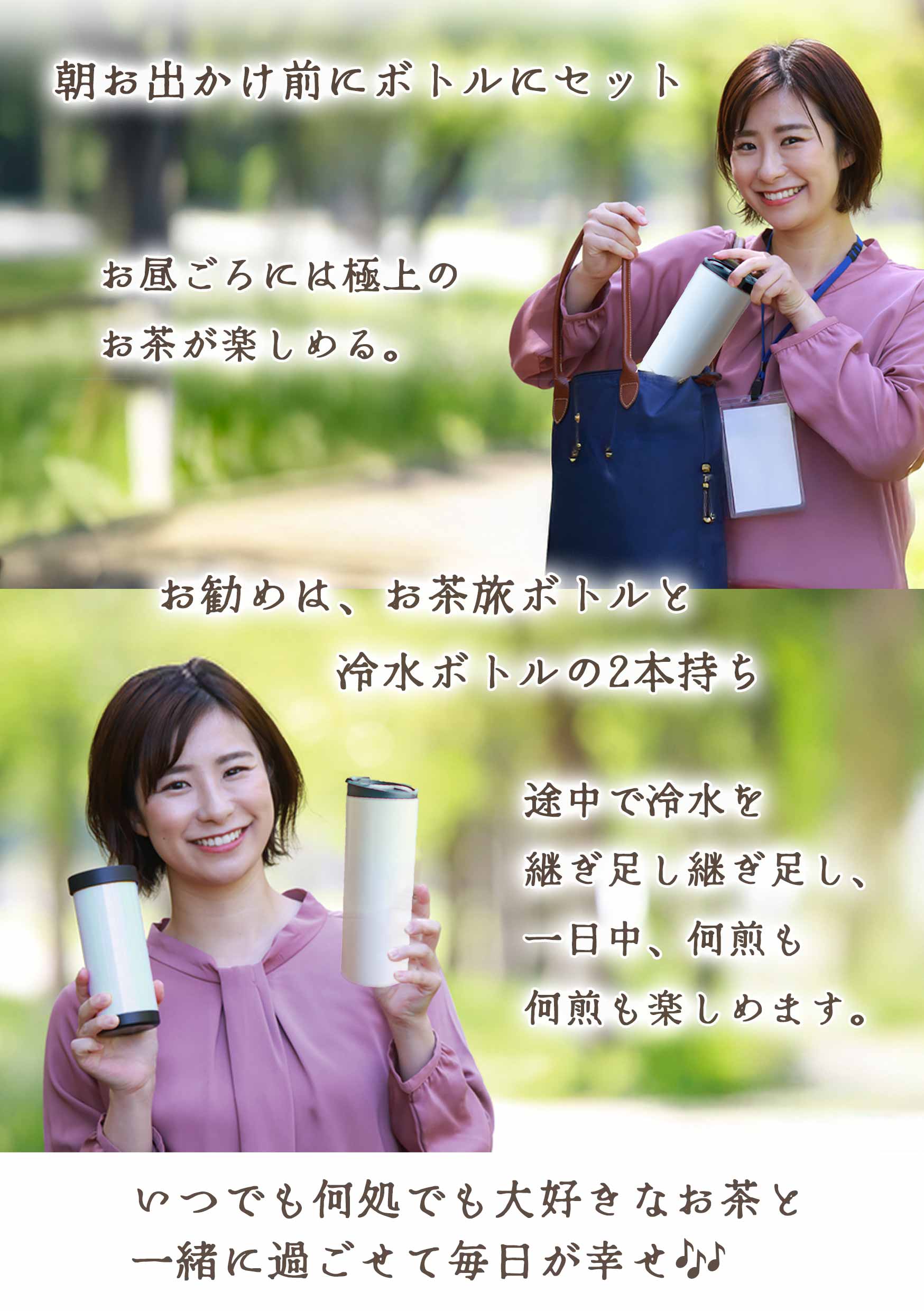![[Set it in the bottle before you go out in the morning.] By lunchtime, you can enjoy the finest tea. / [We recommend carrying two bottles: a tea travel bottle and a cold water bottle.] Add more Raise Designs along the way and brew multiple cups of tea throughout the day. Enjoy your favorite tea anytime, anywhere, and make every day a happy one.](https://image.rakuten.co.jp/kimuraen/cabinet/11057973/m2-05.jpg)