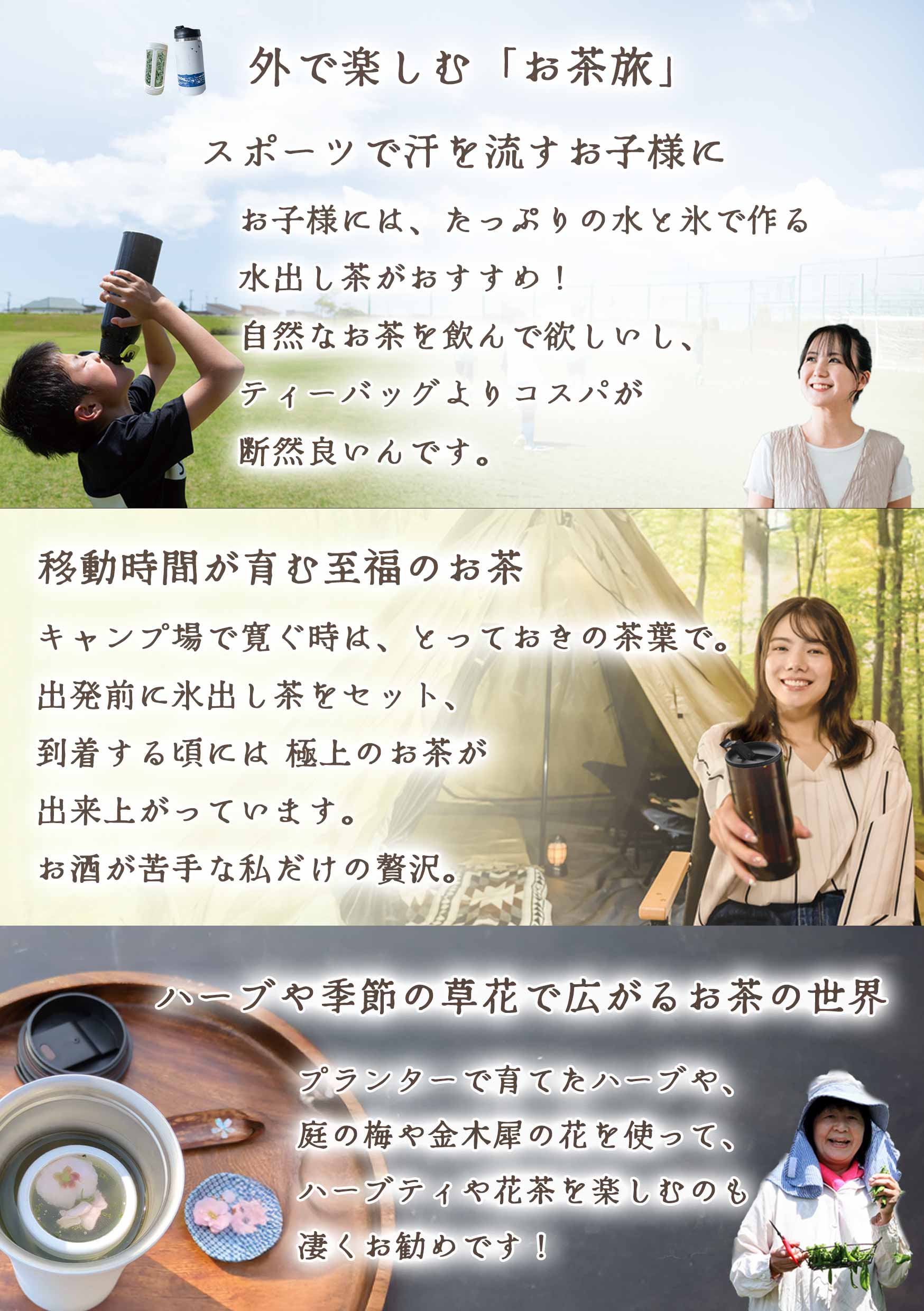 ![[Cold-brewed tea for children who are taking lessons] Cold-brewed tea made with plenty of water and ice is ideal for children who sweat while playing sports. Because we want them to drink natural tea. If you make it from tea leaves, you can get better tea leaves than tea bags at a good price. [A drop of bliss for those who don't like alcohol] When relaxing at a campsite, use your special tea leaves. If you set up iced tea before leaving in the morning, the ultimate tea will be ready by the time you start. A luxurious tea that grows while traveling. / [Tea trip with herbs and seasonal flowers] We also recommend making herbal tea with fresh herbs grown in a planter, or mixing plum, cherry, mandarin, and osmanthus flowers from your garden with tea leaves to make flower tea.](https://image.rakuten.co.jp/kimuraen/cabinet/11057973/m2-07.jpg)
