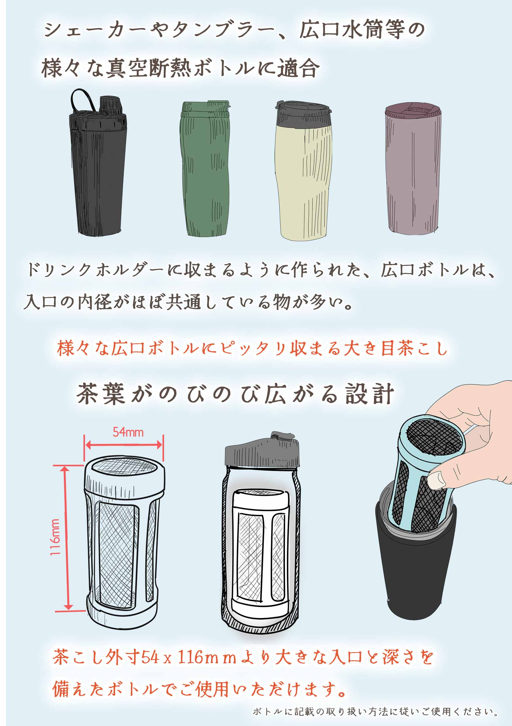 ![[Suitable for various vacuum insulated bottles such as shakers, tumblers, and wide-mouth water bottles] Wide-mouth bottles made to fit into drink holders are almost the same in Japan. [Designed to allow tea leaves to spread freely] Can be used with bottles with an opening and depth larger than the tea strainer's outer dimensions of 54 x 116 mm.](https://image.rakuten.co.jp/kimuraen/cabinet/11057973/a5-09.jpg)