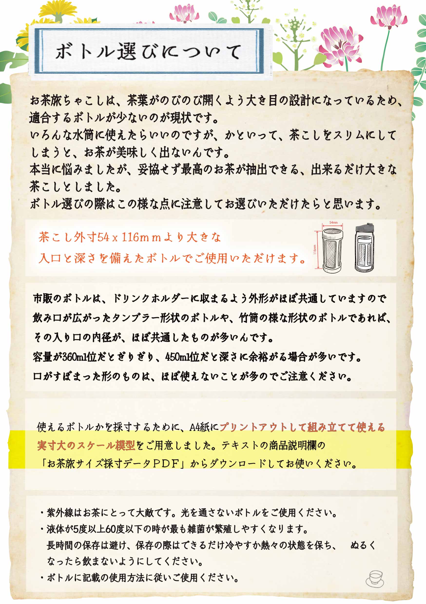 ![[About choosing a bottle] The Ocha Tabi Chakoshi is designed with large openings to allow the tea leaves to spread freely, so there are currently few bottles that are suitable for it. It would be nice if it could be used with various water bottles, but if the tea strainer is made slim regardless, the tea does not come out deliciously. It can be used with bottles with an inlet and depth larger than the outer dimensions of the tea strainer, 54 x 116 mm. Since commercially available bottles have almost the same external shape that can be built into a drink holder, many bottles with a tumbler-shaped opening with a broken mouth or a bamboo-shaped bottle have almost the same inner diameter of the inlet. At around 0 milliliters, it is the limit, and at around 450 milliliters, there is often room for depth. Please note that bottles with a narrow mouth are often almost unusable. We have prepared a scale model that can be assembled and used, almost the largest scale model. Please download and use the "Ocha Tabi Size Measurement Data PDF" in the product description column of the text. /Ultraviolet rays are the enemy of tea. Please use a bottle that does not transmit light. Bacteria are most likely to grow when the liquid is between 5 and 60 degrees Celsius. Avoid storing it for long periods of time, and when storing it, make sure it is ice cold or very hot, and do not drink it if it has become lukewarm.](https://image.rakuten.co.jp/kimuraen/cabinet/11057973/a5-17.jpg)