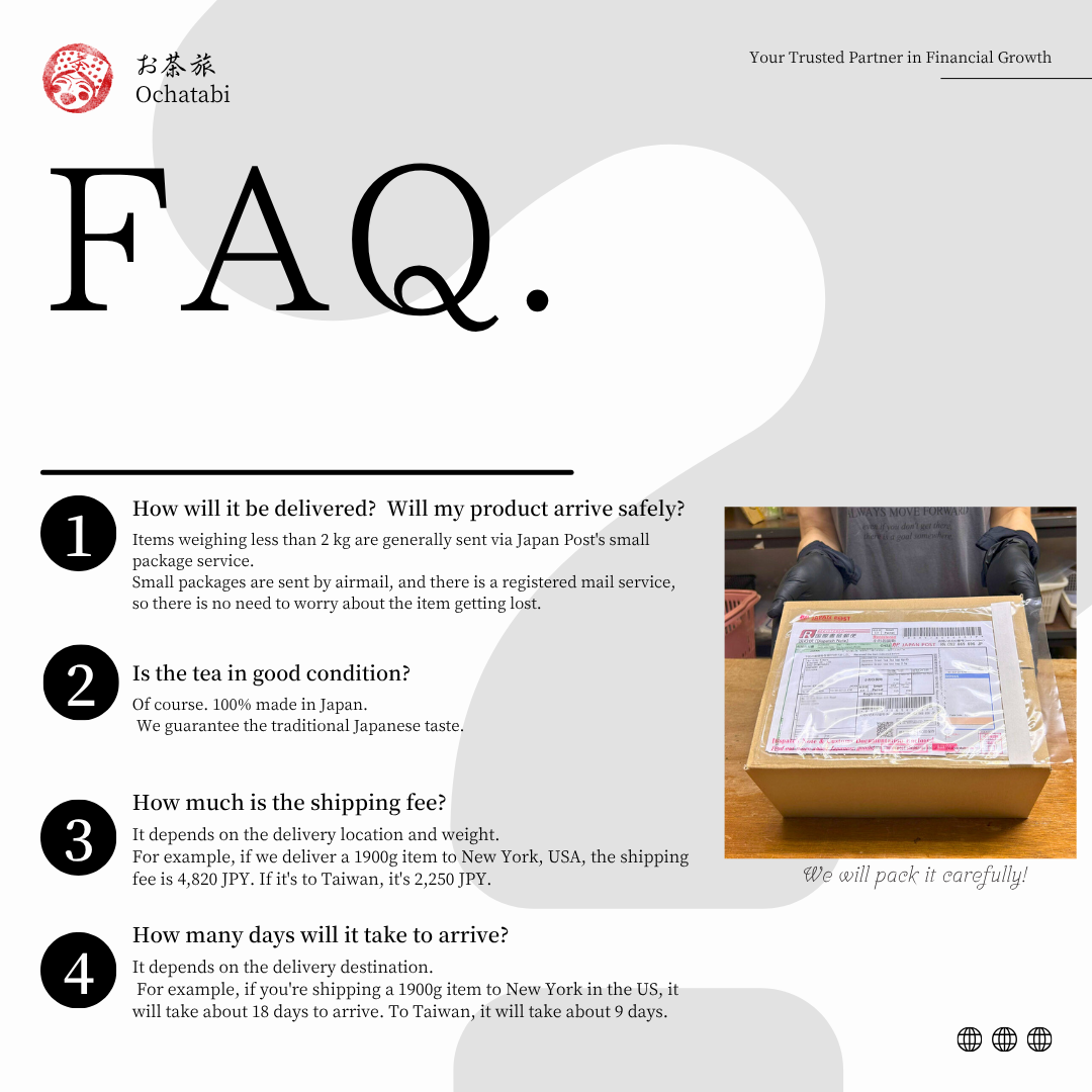 All teas priced at 800 yen or more per 100g can be shipped by post (posted in an A4 size box). (However, arrival date specification and cash on delivery payments are not available)