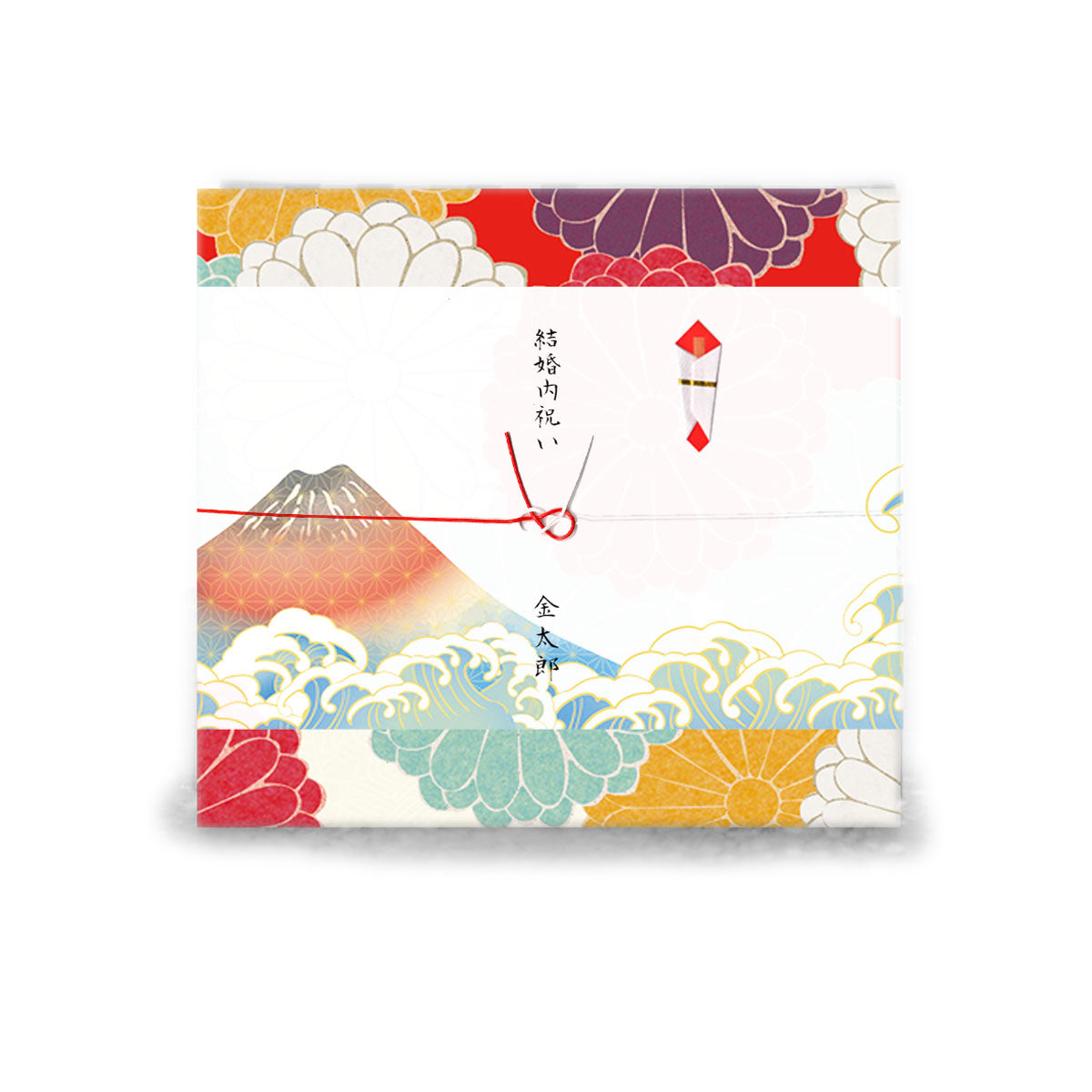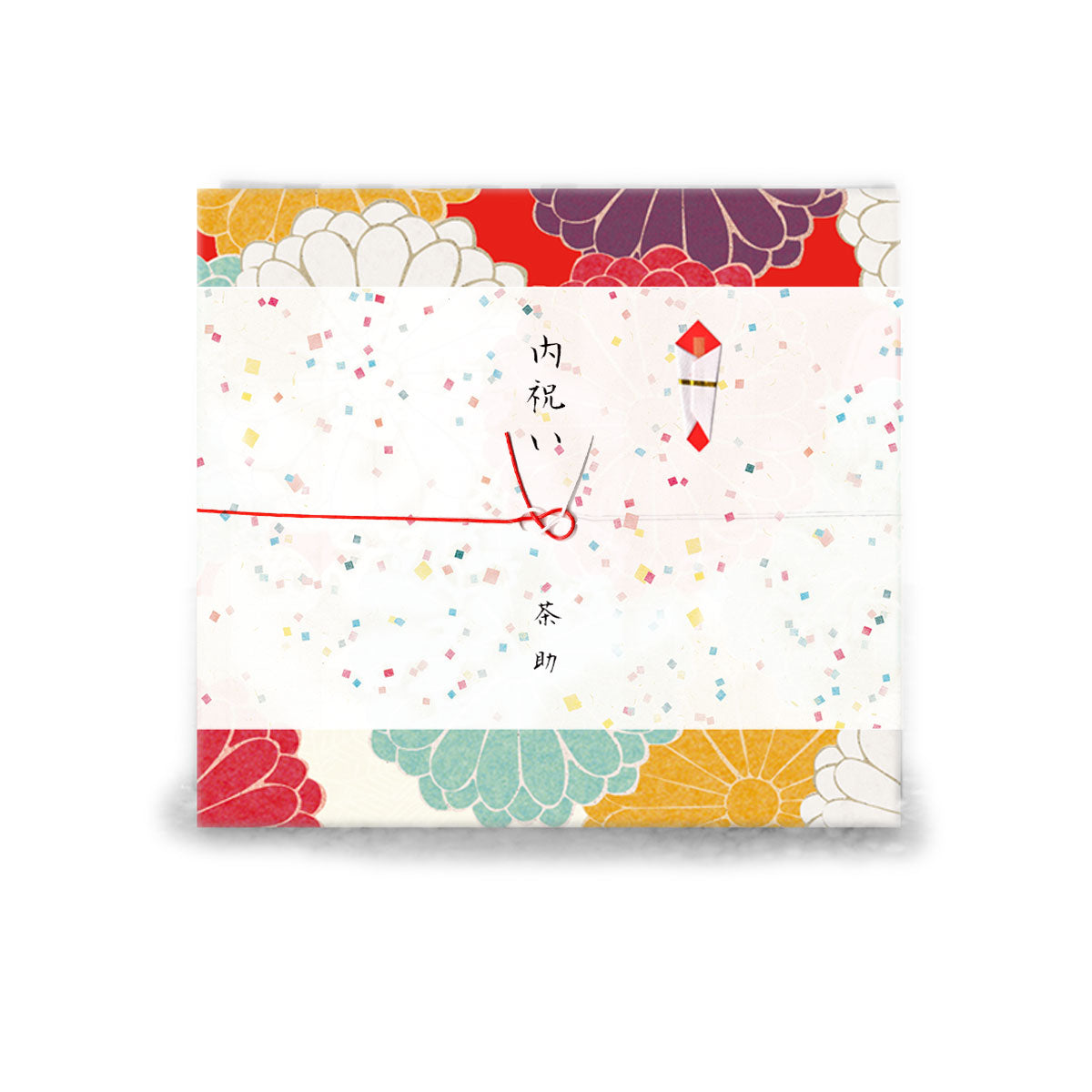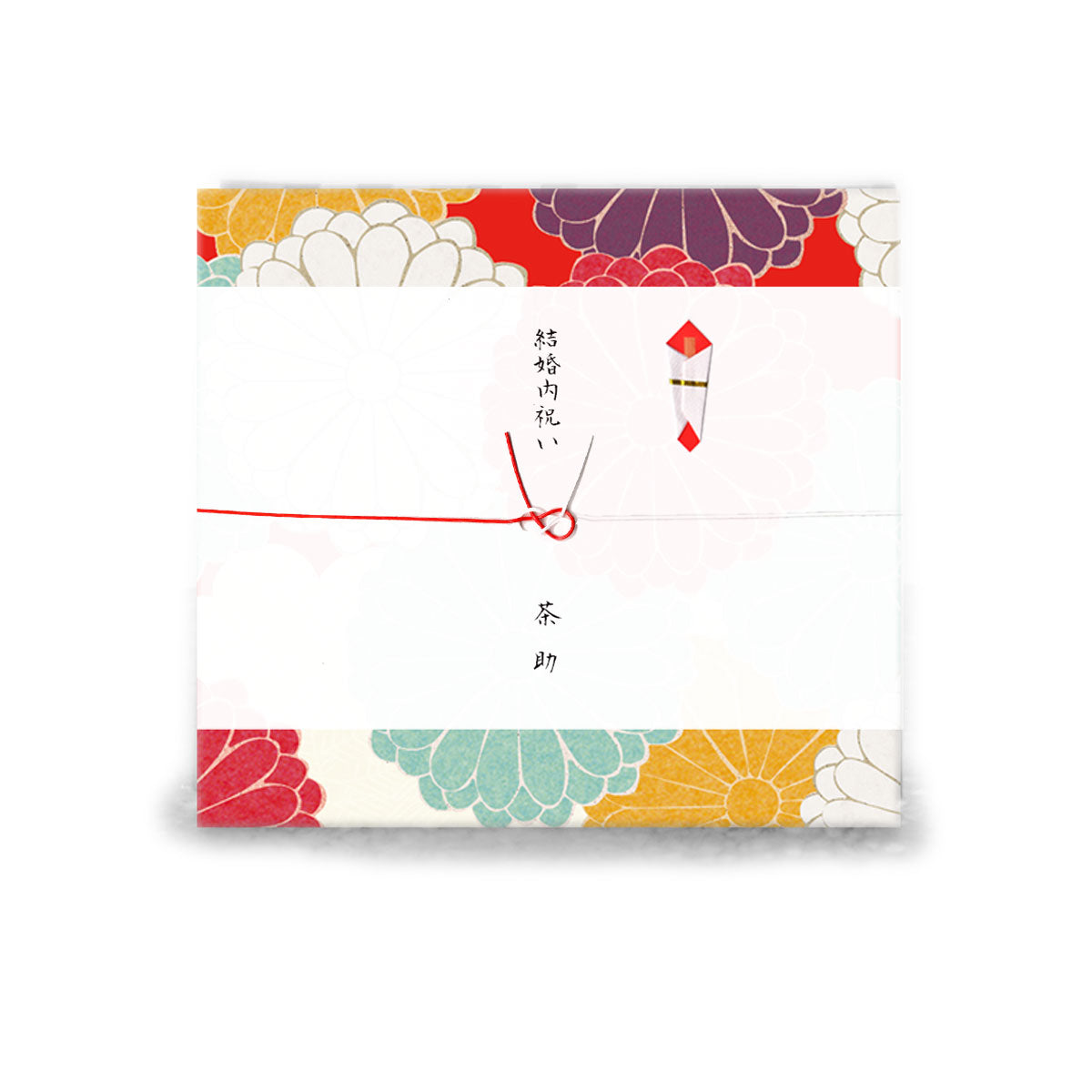 The hanging paper is tied with a red and white bow knotted mizuhiki, and a noshi is attached. This is our original wrapping.