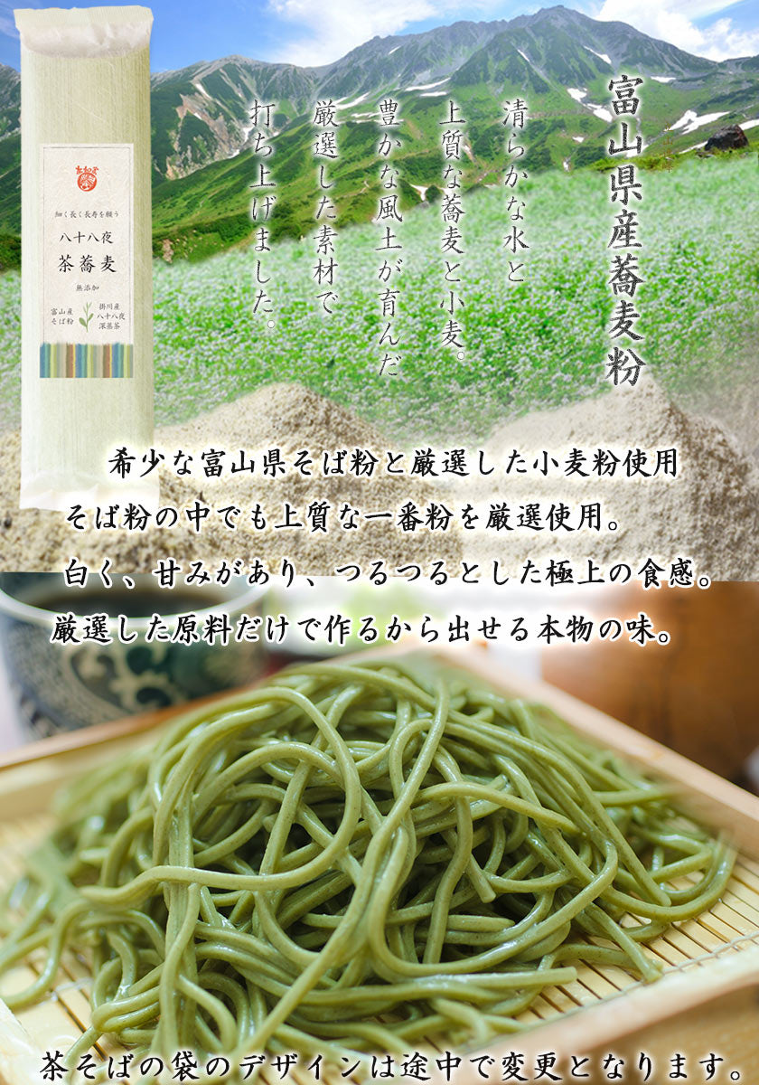 Soba made with Yajuhachiya Shincha from Kakegawa City, Shizuoka Prefecture, and the highest quality Sarashina buckwheat flour from Toyama Prefecture.